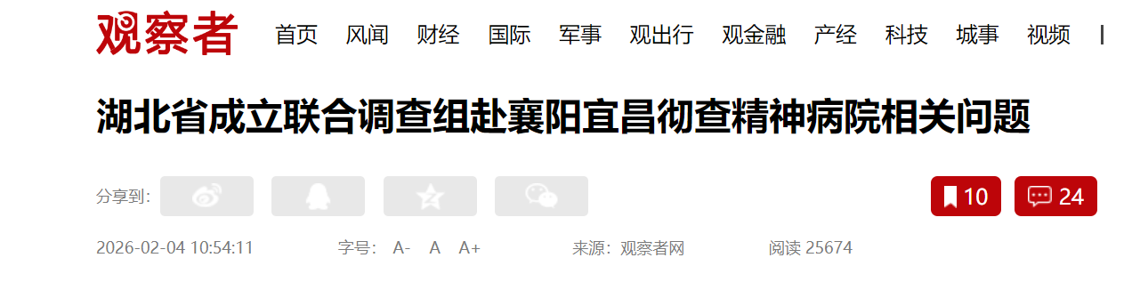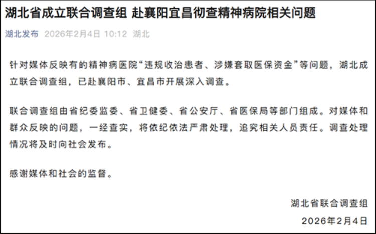 2月3日上昼,湖北省襄阳市专项责任集中探访专班通报称:媒体报说念襄阳市存在神经病院违法收治患者、涉嫌套取医保资金等问题后,襄阳市高度深爱,立即树立责任专班,在全市开展起底式排查探访,一朝核实关联问题将照章从严从速处理。